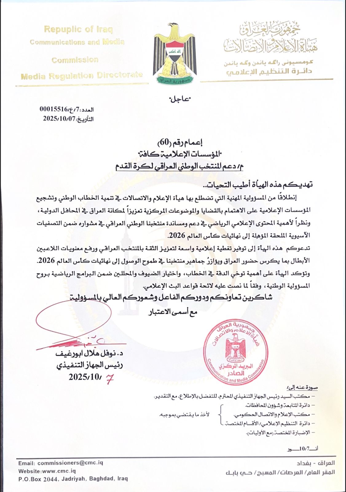 أصدرت هيئة الإعلام والاتصالات، اليوم الاربعاء، تعميماً رسمياً دعت فيه جميع المؤسسات الإعلامية إلى تكثيف جهودها في دعم المنتخب الوطني العراقي لكرة القدم خلال مشواره في التصفيات المؤهلة إلى نهائيات كأس العالم 2026.