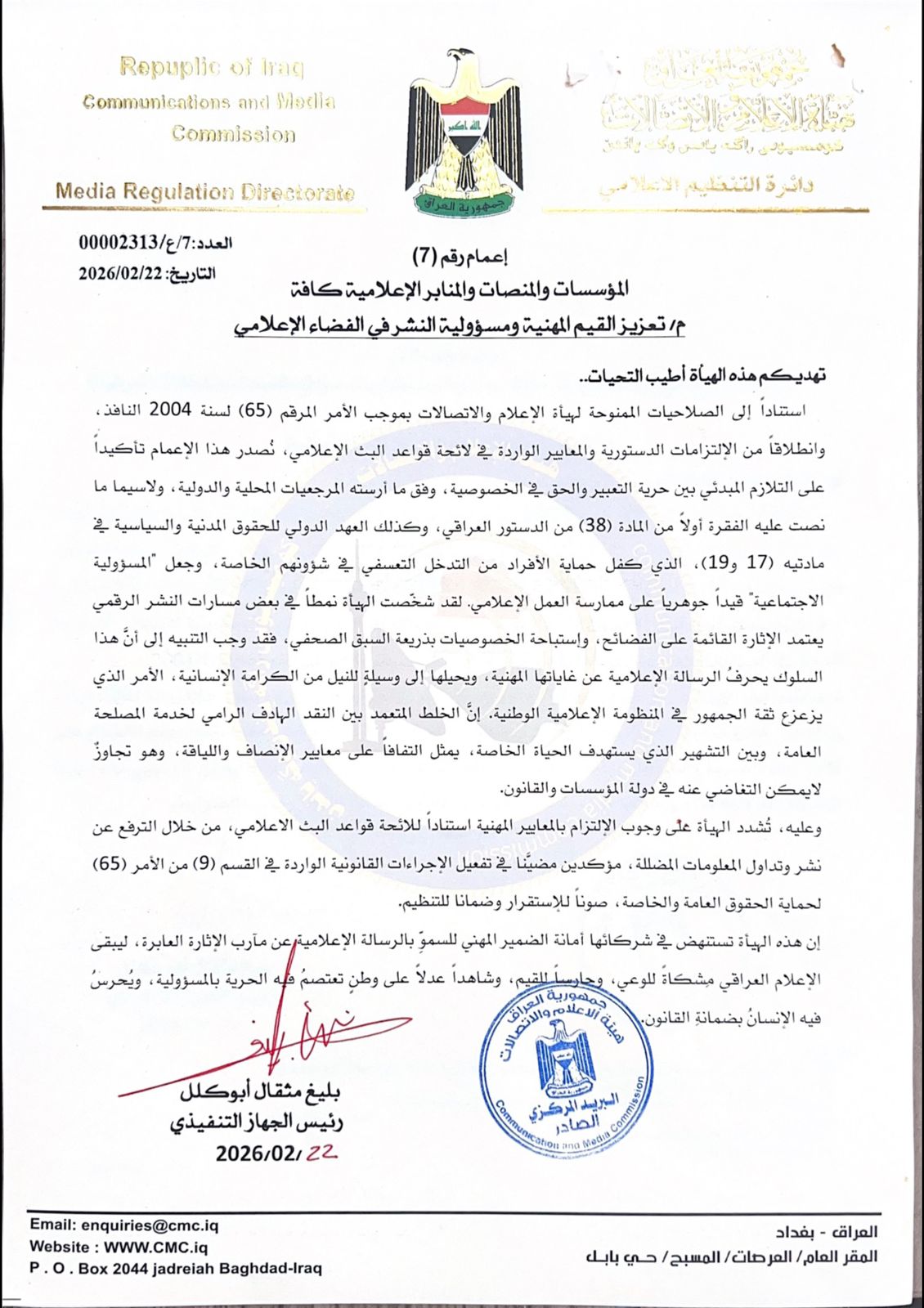 وجاء في التعميم، الصادر عن دائرة التنظيم الإعلامي، أن الخطوة تستند إلى الصلاحيات الممنوحة للهيئة بموجب الأمر رقم (65) لسنة 2004، وانطلاقاً من الالتزامات الدستورية والمعايير الواردة في لائحة قواعد البث الإعلامي، بما يضمن تحقيق التوازن بين حرية التعبير والحق في الخصوصية وفق ما نص عليه الدستور العراقي والمواثيق الدولية ذات الصلة.